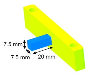 The flow over a bluff body is also considered for the experiments. The configuration of the channel with parallel plates allows extracting the obstacle. By that, another insertion in a form of a bluff body can be used in the same channel. The illustration of this body is depicted in Figure 14. The whole insertion is made of two parts that are connected. The facets of a bluff body are parallel to the channel surfaces. The length, width, and thickness are 20mm, 7.5 mm, and 7.5 mm, respectively.