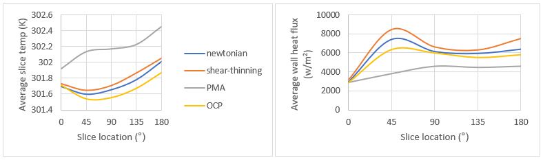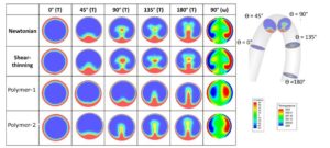 Referring to Figure 4. The shear-thinning fluid resembles the Newtonian fluid temperature profile, with a hot spot in the middle of the pipe. In the viscoelastic fluids as the secondary flow is supressed, the internal temperature field appears later than the other two fluids. However, after the 45° plane, it becomes visible that the thermal boundary layer thickness in the high viscosity fluid is increased and the temperature in the last slice (180°) appears to be higher than the other fluids.