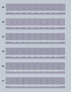 Based on the results reported in the literature eleven different surface structures were developed (Figure 1). The protruded rectangular vortex generators with 30⁰, 45⁰ and 60⁰ angle of attack (see fig. 1(a to c)) were adapted from Ebrahimi’s work [5]. The indented design of rectangular vortex generators with an angle of attack of 30⁰, 45⁰ and 60⁰, was implemented considering the approach of Stroock et al. [6]. The optimum angle of attack was found at 45⁰ and corroborated with [3] and [7], and was considered for surface structure shape with indented and protruded curved vortex generators (see fig. 1d) ) and protruded triangular vortex generators (see fig. 1e). The idea to use protrusions and indentations perpendicular to the flow direction stems from the paper of Li et al. [1] (see fig. 1f). While these and similar structures have been extensively studied in the context of heat transfer, their behaviour in combination with non-Newtonian coolants is largely unexplored.