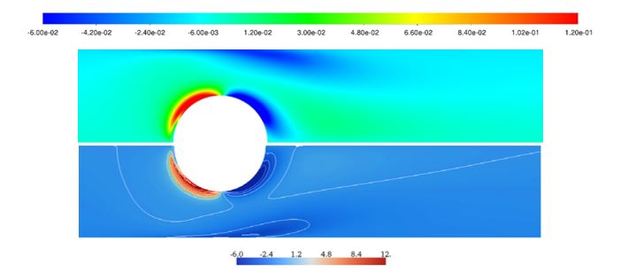 Figure 8 Comparison of shear viscoelastic stresses S_xy for flow over a cylinder at Wi = 0.85: current PTT implementation (top) and reference (bottom).