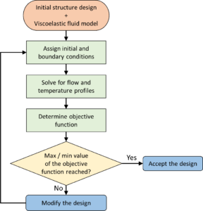 In brief, the coupled momentum and energy equations are solved using fluid properties described by different viscoelastic models (e.g. Giesekus [8], FENE-P [9] etc.), followed by the determination of the objective functions, modification of the geometry accordingly and iterate the process until the maximum (or minimum) value of the objective function is attained.