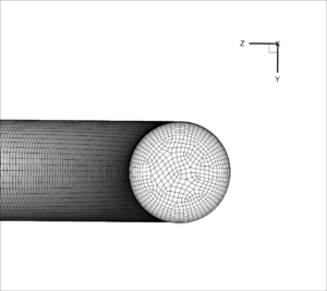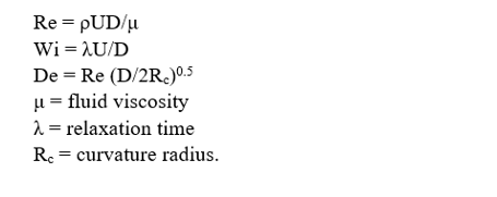 Weissenberg Number: Wi is defined as the product of the shear rate γ̇ and the relaxation time λ and is a measure of comparison of the elastic forces over the viscous forces. The domain length is equal to 30 cm and the height is equal to 2 cm. The radius of the cylinder, RC, is equal to 1 cm and the Reynolds, Re, number based on RC is equal to
