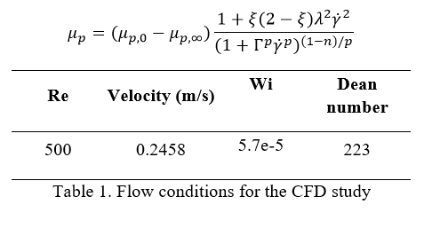 Governing equations for motion of an incompressible viscoelastic fluid including the continuity, the energy conservation and the momentum conservation equations are solved. The viscoelastic polymer stress is defined by constitutive equations defining an Oldroyd-B fluid. The set of governing equations are solved in the Finite Volume Method solver FLUENT where the viscoelastic models are implemented through the general scalar ∅ transport equation with user defined scalars (UDS).